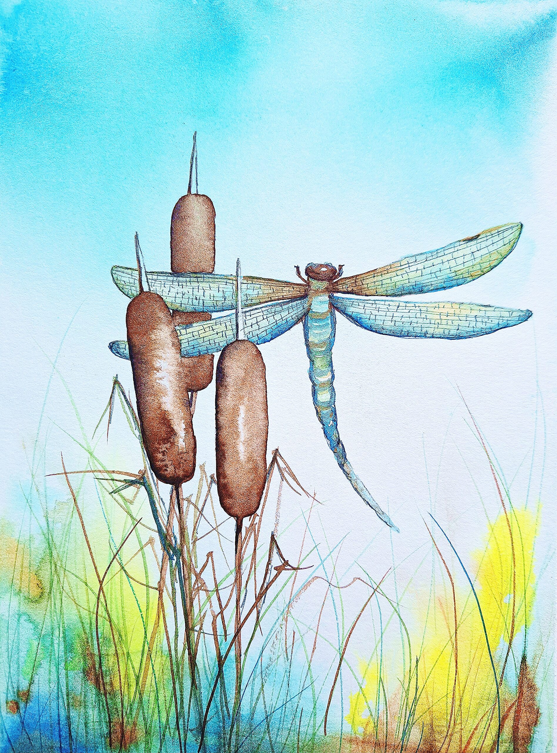 This is the perfect opportunity to have a go with the gorgeous colours of Acrylic Inks, to create your own beautiful painting of a shimmering Dragonfly, on a background of loose colours and delightful Bullrushes.